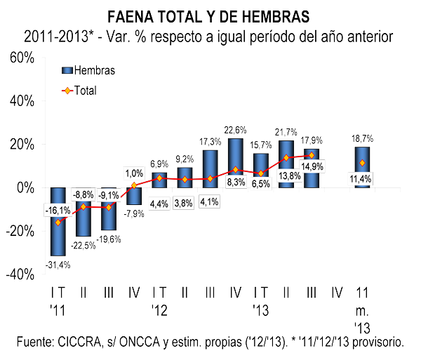 La industria frigorífica faenó 1.050.000 cabezas de ganado vacuno en noviembre. En esta ocasión la totalidad de la expansión se explicó por el aumento de la faena de hembras, ya que la de machos retrocedió con respecto a noviembre de 2012. Esto a su vez hizo que la participación de las hembras en la faena total fuera superior al valor crítico de 43% por segundo mes consecutivo, confirmando que la fase de retención de vientres iniciada en la primavera de 2009 llegó a su fin durante el invierno y que el sector pecuario está a las puertas de ingresar en una nueva fase contractiva del ciclo.