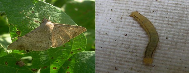 Foto 1 y 2. Adulto y larva de Anticarsia gemmatalis respectivamente