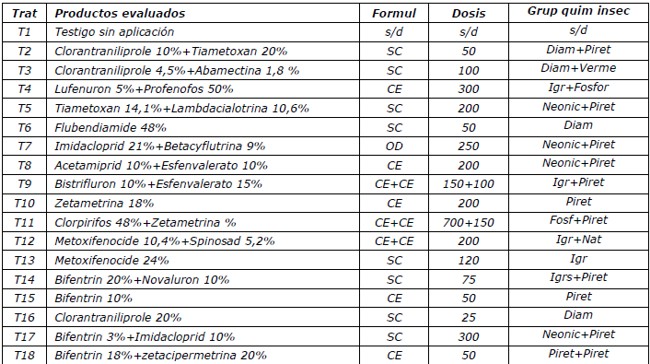 Al momento de la aplicación del ensayo se contaron 13 larvas de Anticarsia gemmatalis por metro lineal. Los tratamientos realizados se detallan en la tabla 1.
