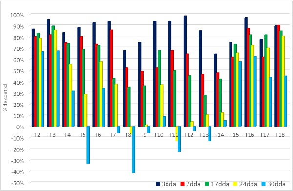 En la figura 1, se presentan los resultados como porcentajes de control a los 3, 7 y 17, 24 y 30 dda de los mismos respecto del testigo sin aplicación.