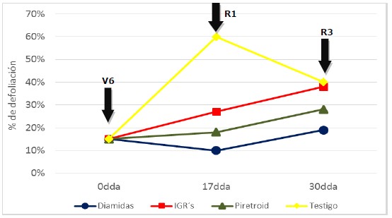 A los 17 dda los productos, los diferentes grupos químicos se diferenciaron respecto del testigo y entre ellos. Las diamidas presentaron la menor defoliación seguida de los piretroides y luego los IGR’s.