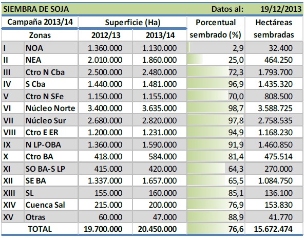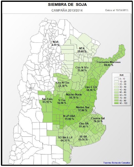Lotes de primera ya implantados en Córdoba están siendo tratados para controlar ataques de isoca bolillera en Villa María, Oncativo, Sinsacate y Pilar, entre otros. En términos generales los cuadros de toda la provincia aún diferencian de 2 a 5 nudos (V2-V5), y algunos pocos más adelantados inician etapas reproductivas de floración (R1). En cambio en la provincia de Santa Fe, los primeros cuadros implantados ya diferencian hasta siete nudos (V7), y una escasa superficie sembrada temprana en primavera, comienza a diferenciar vainas (R3), en periferia a Avellaneda sobre el extremo noreste de la provincia. Sobre los Núcleos Norte y Sur también informan ataques de oruga bolillera, mientras varios cuadros sembrados en fecha temprana inician la etapa de floración (R1).