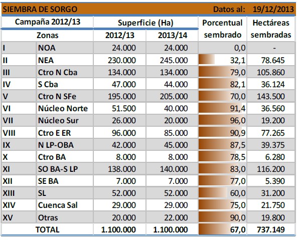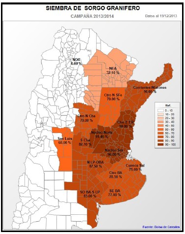 En la importante región sorguera del Sudoeste de Buenos Aires y Sur de La Pampa, el progreso de siembra estuvo estrechamente relacionado a la oferta hídrica en los perfiles, y a la fecha se estima que un 83 % del área apta ya fue implantada. No obstante, el área remanente se encuentra a la espera de nuevas precipitaciones que permitan concretar la intención de siembra prevista para esta campaña.