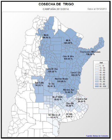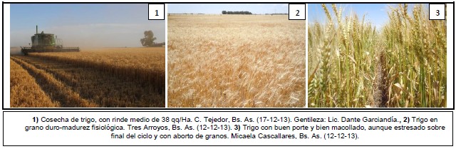 En el Centro-Norte de Santa Fe el 60 % de los cuadros se encuentran en llenado de grano, en muy buenas condiciones, acompañados por una adecuada condición hídrica. En cercanías a Reconquista, la recolección de los primeros lotes comenzaría en un plazo de 15 días, y se espera que el rinde medio se encuentre próximo al promedio histórico (16 qq/Ha).