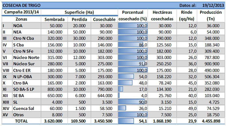 Otro de los núcleos trigueros como lo es el Sur de La Pampa y Sudoeste de Buenos Aires, en donde se concentra más del 22 % del área nacional, se encuentra en plena cosecha. Los rendimientos relevados se ubican por debajo de los estimados un mes atrás, debido a la falta de precipitaciones durante la fase de llenado de grano. Dependiendo la zona, las mermas de rinde oscilan del 10 al 15 %. En Coronel Suárez, las productividades relevadas van de los 30 a 45 qq/Ha, hacia Darregueira los rindes son más dispares y dependiendo los lotes se relevaron productividades desde los 15 a 40 qq/Ha. En Santa Rosa, Macachín, Guatraché disminuyen los rendimientos, ubicándose desde los 12 hasta los 30 qq/Ha. Las regiones Centro de Buenos Aires y Cuenca del Salado reportaron fluidos progresos en los últimos días, con rindes obtenidos que van desde los 38 hasta 60 qq/Ha.