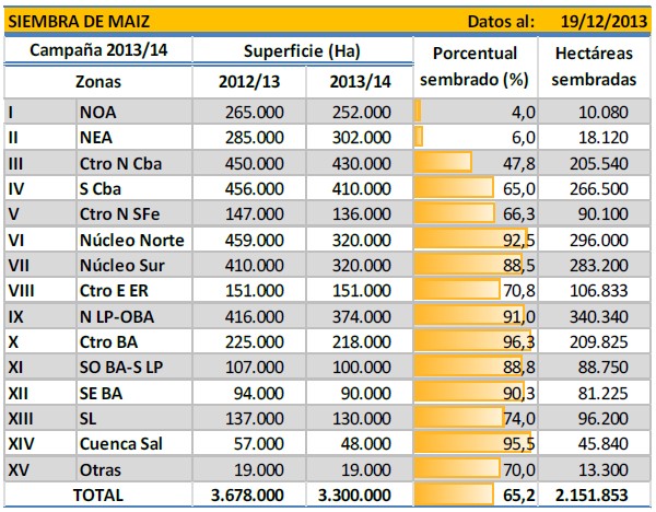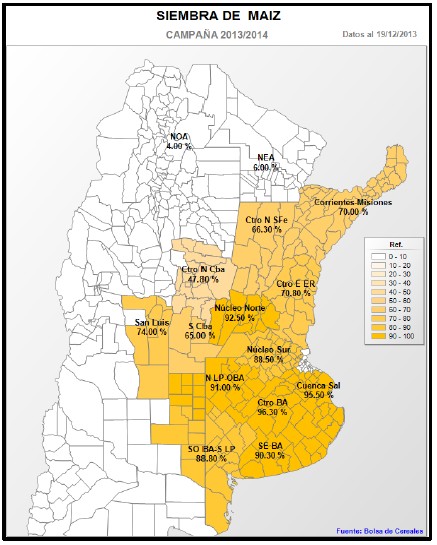 Durante los últimos siete días, la siembra de maíz tardío o de segunda ocupación continuó cobrando impulso, incrementando el área implantada al 65,2 % de la superficie proyectada en 3.300.000 . El actual avance de siembra permite calcular un progreso hectáreasintersemanal de 10 puntos porcentuales, y tan sólo un retraso de 2 % interanuales. En números absolutos, se implantaron 2,1 MHa. El fuerte avance de la última semana se debe a la actividad de siembras tardías en la provincia de Córdoba y las zonas Núcleo Norte y Sur, como así también en el Norte de La Pampa y Oeste de Buenos Aires.