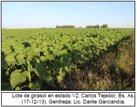 En el Sudoeste de Bs. As. y Sur de La Pampa el girasol se encuentra algo más atrasado en su desarrollo, dado que la siembra culminó más tarde que en otras zonas. Actualmente se pueden ver lotes diferenciando hojas (5 a 6 pares de hojas desarrolladas) pero denotando una condición de cultivo regular, ya que esta región no ha recibido nuevos pulsos hídricos que ayuden a mejorar el estado general de los lotes.