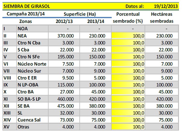 La estimación nacional de área implantada es de 1.480.000 hectáreas para la campaña en curso, y durante la última semana se han trillado lotes puntuales de girasol en el extremo norte del país. Los primeros cuadros recolectados se ubican en el NEA, más específicamente en Chaco, arrojando rindes promedio bajos para la región (Pampa del Infierno y Sáenz Peña: 12 qq/Ha, Las Breñas y Charata 15 qq/Ha).