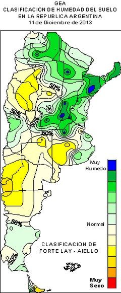 El acumulado durante diciembre de la región núcleo, en promedio, es de 35,7 mm; son pocas las localidades que superan los 50 mm acumulados. Las marcas térmicas fueron muy elevadas, fundamentalmente durante los primeros días del período, y se mantuvieron entre los 35 y 40°C. Se superaron las marcas de la semana anterior y los parámetros normales para el mes de diciembre. Con este panorama se observa una disminución de las reservas de humedad con respecto a la semana pasada.