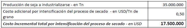 Según datos de la Bolsa de Comercio de Rosario, de la producción nacional de soja de la campaña 2012/2013, se terminarían destinando aproximadamente 35 millones de toneladas a la industrialización3, para la obtención de aceite y harina. Por lo tanto, extrapolando la información de la planta de crushing modelo a toda la industria, se estima que para incrementar el porcentaje de proteína en la harina de soja mediante el proceso de secado adicional se asignarán recursos por USD 17,5 millones en la presente campaña comercial, por una mayor utilización de gas y energía eléctrica.