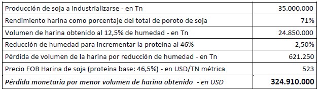Si se considera un precio FOB argentino actual de USD 5234 para la harina de soja, lo anterior implicaría una caída en la facturación de la industria oleaginosa argentina de casi USD 325 millones, debido a la reducción del volumen de la harina obtenida, medido en toneladas, como consecuencia del proceso de secado adicional. Ello puede apreciarse en la tabla 2.