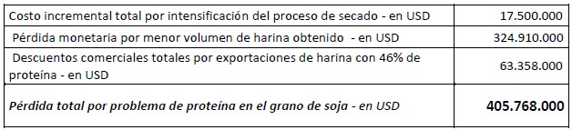 En un intento por cuantificar este problema y determinar cuánto le cuesta al país obtener un subproducto oleaginoso de la calidad requerida internacionalmente, se calcularon los costos adicionales en los que la industria procesadora debe incurrir y la pérdida de ingresos que genera la caída en la proteína de la materia prima.