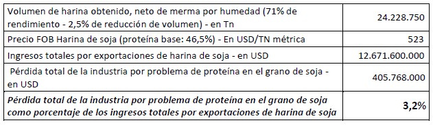 Si se supone que las 24,2 millones de toneladas de harina de soja se comercializan al precio FOB tomado como referencia de USD 523/Tn, el ingreso total derivado de la venta del subproducto al exterior sería de aproximadamente USD 12.671 millones, por lo que las pérdidas ocasionadas por la menor calidad proteica del haba de soja estarían representando un 3,2% del total de los ingresos obtenidos por el país bajo este concepto.
