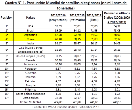 Las perspectivas para la nueva campaña estarían confirmando el nuevo posicionamiento de nuestro país en el tercer lugar, ya que de acuerdo a las proyecciones que realiza Oil World para el ciclo 2013/2014, Argentina podría estar en condiciones de producir 57,8 millones de toneladas de semillas oleaginosas, en tanto que China alcanzaría unos 48,4 millones de toneladas.