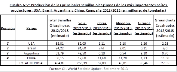 Según datos de OIL Word, en los últimos cinco años los principales países productores de semillas oleaginosas fueron los Estados Unidos de América y Brasil, con una producción anual promedio en el período 2008/2009 a 2012/2013 de 94,32 y 73,03 millones de toneladas, respectivamente.