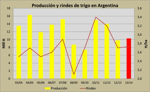 En función de esto el período 13/14 se asemejaría al ciclo 12/13, a partir de lo cual resulta inexplicable que por ahora se prohíban los envíos de trigo al mundo, considerando que lo destinado a molinería se mantiene estable con el correr de los años levemente por encima de 6 mill tt. Si se habilitaran 3 mill tt las existencias serían de aproximarían a 1 mill tt, tal como hemos visto en las últimas campañas.
