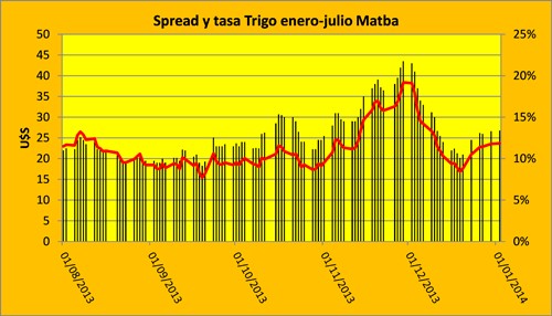 El gráfico 3 es un reflejo de esta situación; las barras negras y el eje izquierdo expresan el diferencial entre los vencimientos enero y julio (habiendo llegado a finales de noviembre a niveles mayores a U$S 40, mientras que ahora se acerca a U$S 30), en tanto que la línea roja y el eje derecho indican la tasa implícita que existe entre ambos meses.