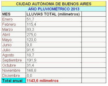 En un informe del blog Meteorología de Buenos Aires (MET BA), se destaca que el año que quedó atrás (2013) será recordado por dos eventos importantes que afectaron a la ciudad de Buenos Aires y su entorno: las lluvias copiosas del 2 de abril y la Ola de calor histórica del último mes del año.