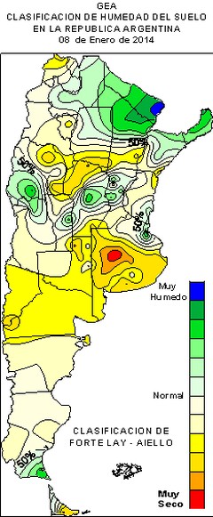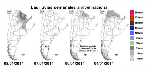 Entre el jueves 2 y el miércoles 8 de enero se desarrollaron lluvias generalizadas en toda la región GEA. Entre los acumulados mas significativos se destacan Labordeboy, (Santa Fe) e Idiazabal, (Córdoba), con registros de 97,2 mm y 82 mm, respectivamente. La zona central de GEA recibió promedios de 40 y 70 mm, mientras que el noreste de Buenos aires y el sudeste de GEA los acumulados fueron de 20 y 30 mm. En cuanto a las marcas térmicas, los valores más elevados se mantuvieron entre los 36 y los 38°C, siendo similares a los de la semana anterior, y por encima de los parámetros normales para el mes de enero. El valor más elevado fue de 40,3°C registrado en la localidad de Hernando (Córdoba).