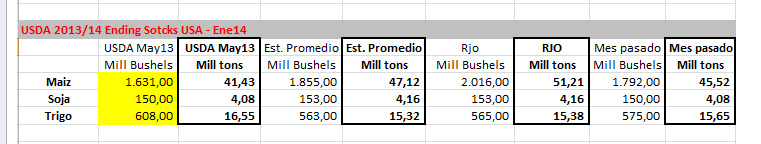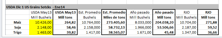 En su reporte de Oferta y Demanda mensual, el Departamento de Agricultura de los Estados Unidos (USDA, por sus siglas en inglés) informó una baja muy importante en los stocks trimestrales de maíz norteamericano al 1° de diciembre de 2013 (-9,24 M/Tns., quedando en 264,84 M/Tns.), al tiempo que para Argentina también marcó una baja, aunque menor, de 1 millón de toneladas (M/Tns.), pasando la producción total de 26 M/Tns a 25 M/Tns.
