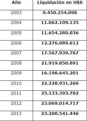 La liquidación de divisas de las empresas del sector en los últimos años fue:
