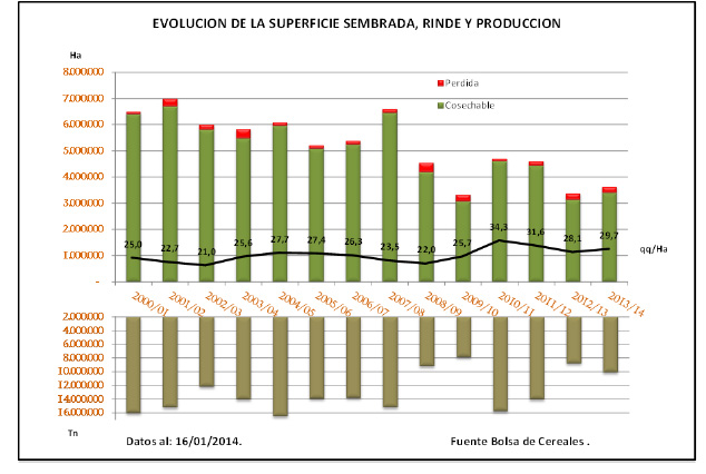 Cabe destacar que la superficie perdida fue muy similar a la relevada el ciclo previo (2012/13: 240 mil Ha), no obstante la diferencia radica en el norte del área agrícola nacional, producto del invierno seco que castigó al cultivo. En cambio, en la campaña anterior se registraron fuertes pérdidas de área en la zona sur debido a los excesos de humedad, lo que impactó negativamente sobre la producción.