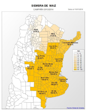 En el tramo final de la siembra de maíz con destino grano comercial el avance intersemanal registró un progreso de tan sólo 3,2 puntos porcentuales, denotando así un retraso interanual de -7,4 puntos. A la fecha se llevan implantadas más de 2,8 millones de hectáreas, que en números porcentuales representan el 86 % de la superficie proyectada para esta campaña en 3.300.000 Ha. Este retraso se adjudica a la ausencia de precipitaciones que permitieran recuperar la humedad en el perfil en tiempo y forma, para así garantizar una óptima implantación del cereal.