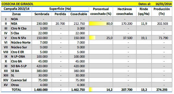 La cosecha de girasol registra un progreso del 14,2 % a nivel nacional, habiéndose recolectado unas 207.700 hectáreas que aportan un volumen acumulado en chacra superior a las 270 mil toneladas. Durante los últimos siete días se registró un avance del 3,6 %, y en comparación con la campaña pasada 2012/13 un retraso interanual de -4,9 puntos.