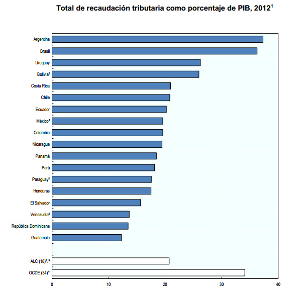Existen amplias diferencias nacionales entre las tasas de ingresos tributarios de los países latinoamericanos. La lista es encabezada por Argentina (37,3%) y Brasil (36,3%), que se encuentran por encima del promedio de la OCDE, mientras que al final se ubican Guatemala (12,3%) y República Dominicana (13,4%). Entre los países de la OCDE, ese mismo rango varía entre 48% en Dinamarca y 19,6%[2] en México.