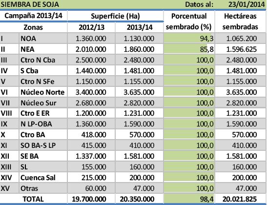 Sin haber finalizado aún la siembra, el área implantada a la fecha ya es récord a nivel nacional. No obstante, la condición dispar de los cuadros, que ya transitan etapas críticas en algunas regiones importantes, no permite trasladar este récord de superficie a una proyección récord de producción. A pesar de esto último, y teniendo en cuenta el escenario actual, el volumen a cosecha previsto para la presente campaña podría ascender a 53.000.000 de toneladas. De concretarse esta proyección, estaríamos registrando un incremento interanual de cosecha de un 9,3 % en comparación al ciclo previo (Campaña 12/13: 48,5 MTn cosechadas).