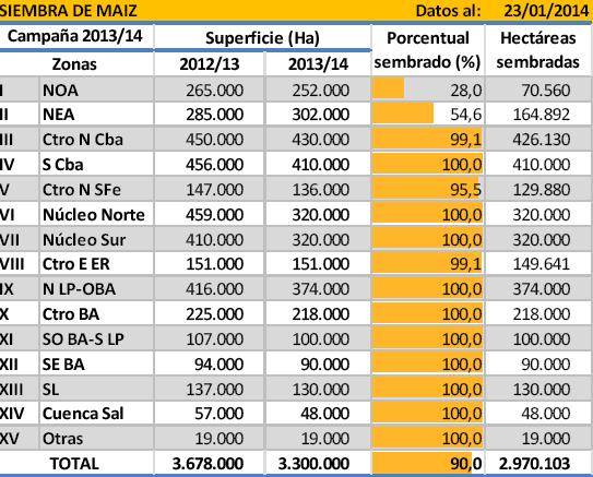 El progreso de siembra logró cubrir el 90 % a nivel nacional, con un área proyectada para esta campaña en 3.300.000 hectáreas. El avance intersemanal es de 4 puntos porcentuales, dejando un retraso interanual de -6,4 puntos.