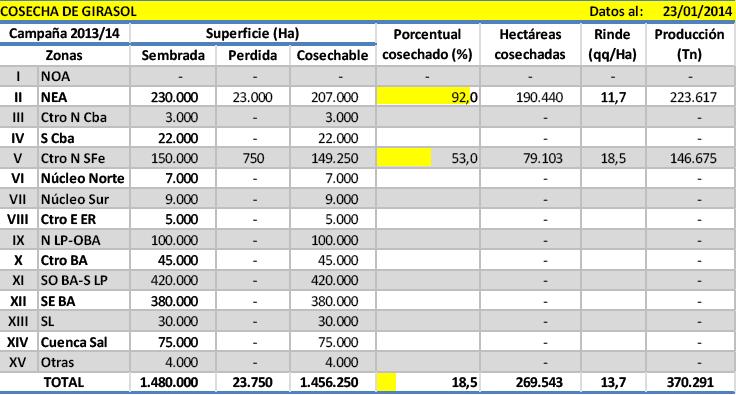 Analizando las actuales condiciones que atraviesa el girasol en nuestro país, realizamos un ajuste en la proyección de producción, ubicándose a la fecha en 2.300.000 toneladas. De esta manera se sitúa un -8 % vs. la anterior publicación (16-01-14: 2.5 MTn), y al mismo tiempo un -23,3 % por debajo de la producción alcanzada la campaña pasada (2012/13: 3.3 MTn).