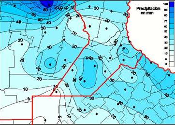 Se destacan los acumulados del centro-este de Córdoba con registros entre 50 y 100 mm. El registro más alto ocurrió en la localidad de Pozo del Molle (Córdoba) con un acumulado de 110 mm. En el noreste de Buenos Aires y Sur de santa Fe las lluvias rondaron entre 20 y 40 mm. Mientras que en el noroeste de Buenos Aires y la localidad de Rufino (Santa Fe) la precipitaciones fueron nulas. Como se observa en el mapa, hay un gradiente de lluvias que disminuye desde el noreste al sur oeste de la región núcleo del país.