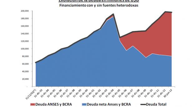 En el año 2001 la Deuda Pública Nacional Bruta sumaba US$ 144.222 millones (53,7% del PBI). A julio de 2013, el valor nominal de la deuda alcanzó los US$ 196.143 millones, que si bien implican una caída nominal en dólares, se debe únicamente a la aceleración devaluatoria; es decir a que la deuda nominada en pesos se incrementó menos que el tipo de cambio oficial. la deuda total representa un 43.6% del PBI, que sin el ANSES y el BCRA asciende al 18%. A su vez, la deuda con residentes extranjeros, tanto del sector privado, gobiernos y organismos internacionales, asciende a US$ 58.900 millones, es decir al 13% del PBI, el 154% del las reservas internacionales y el 71% de las exportaciones de los últimos 12 meses (comprendidas entre junio 2013 y julio 2012).
