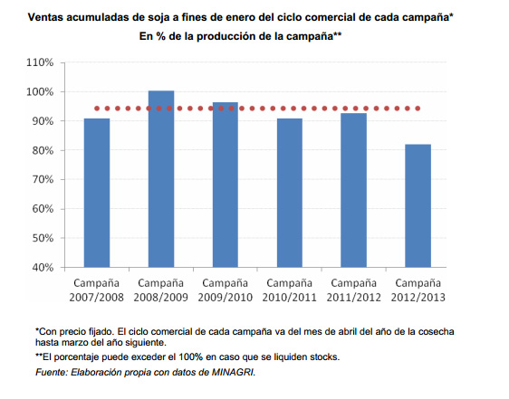 • Un tipo de cambio muy atrasado junto con la modalidad elegida por el gobierno para corregir el problema, gradualista hasta el salto devaluatorio de la última semana, incrementaron los incentivos a retener la soja. Entre los meses de marzo y agosto del 2013 las ventas promediaron las 4,3 millones de toneladas mensuales, entre setiembre y noviembre bajaron a 2,3 millones de toneladas y en los últimos dos meses a 1,6 millones de toneladas.