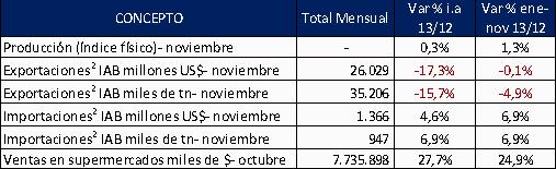 En base al conjunto de sectores que integran la IAB, se registró en noviembre una suba de la producción de 0,3% respecto a igual mes de 2012 (dato preliminar), manteniendo el crecimiento interanual registrado desde abril.