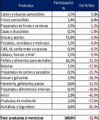 El resto de los sectores sufrieron caídas interanuales en noviembre. En cuanto a las mayores caídas, se registraron en los sectores de “hortalizas y legumbres”, (81,3%) “productos de molinería” (57,6%), y “arroz” (43,5%). En el primer caso, la baja estuvo asociada al rubro “legumbres” (86,4%), especialmente por la caída de las exportaciones de porotos, asociada a la baja en la producción por la sequía que se registra en las regiones productivas.