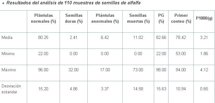 Datos de más de 100 muestras de semillas de alfalfa analizadas durante los años 2010, 2011 y 2012, presentan una gran dispersión en los resultados, y muestran la necesidad de contar con el análisis de la semilla para definir correctamente la densidad de siembra que permita lograr la cantidad de plantas buscadas.