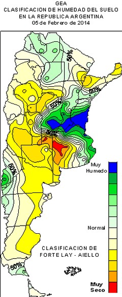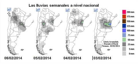 Entre el jueves 30 de enero y el miércoles 5 de febrero, la presencia de abundantes lluvias en toda la región continuó favoreciendo la recomposición de las condiciones hídricas. En esta semana en particular, se observaron excesivas lluvias en el norte de la provincia de Buenos Aires y sur de Santa Fe, con acumulados que fueron superiores a los 200 mm como en Santa Teresa (Santa Fe), con 303mm o en Pergamino, (Buenos Aires) con 281mm. En el resto de la región las lluvias promediaron entre 80 y 140 mm.