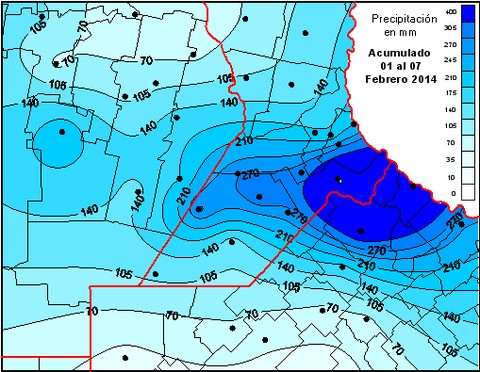 El noreste bonaerense totalizó en lo que va del mes 400 mm. Llama la atención que, sin haber influencia del fenómeno del “Niño”, se haya producido en evento de semejante intensidad y duración con el agravante de continuar en la próxima semana. Esto muestra un escenario absolutamente opuesto al mes de febrero del año pasado donde el patrón de desecamiento se profundizaba. Actualmente los suelos colapsan de humedad hasta el punto del anegamiento en áreas bajas y persiste la alerta de nuevas lluvias en la región. En febrero del 2013, cuando la escasez hídrica era el eje del problema hubo impacto y posterior caída de la producción nacional de soja.