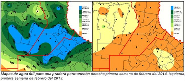 Los paupérrimos acumulados de lluvias de febrero del 2013 y las elevadas temperaturas produjeron un detrimento muy importante de las reservas hídricas, y muchas zonas presentan un principio de sequía. Ante éste balance hídrico altamente negativo, hubo pérdidas de plantas de soja y a ello se sumaba una importante presión de plagas. El antagonismo de aquella situación se observa en la comparación de las imágenes de las reservas de humedad de suelo para una pradera permanente.