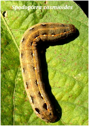 La larva tiene entre 6 o 7 etapas de desarrollo, hasta 8 en soja, lo cual puede significar una menor adecuación de este cultivo para el desarrollo de las larvas. Las orugas recién eclosionadas tienen coloración marrón clara con cabeza negra, presentando un abultamiento entre el tórax y el abdomen, el cual luego de los primeros estadios va desapareciendo. En su último estadio la longitud varía entre 40- 45 mm., son larvas robustas, con la cabeza más pequeña que el cuerpo, con 3 líneas longitudinales en el dorso de color naranja (una línea central discontinua y dos laterales), con puntos blancos. Sobre estos puntos blancos se observan triángulos negros apuntando hacia el dorso del insecto. En cada segmento abdominal, sobre las líneas exteriores hay dos manchas triangulares blancas y presentan una franja oscura entre el tercer par de patas torácicas y el primer par de patas falsas abdominales y otras dos franjas en las extremidades finales del abdomen. A la vista presentan un aspecto aterciopelado. El período larval de Spodoptera cosmioides varía entre 13 y 28 días con temperaturas entre 22 y 30 °C. Las pupas presentan el patrón común de los noctuidos y son encontradas en el suelo, siendo de color castaño, sin pelos y brillosas.