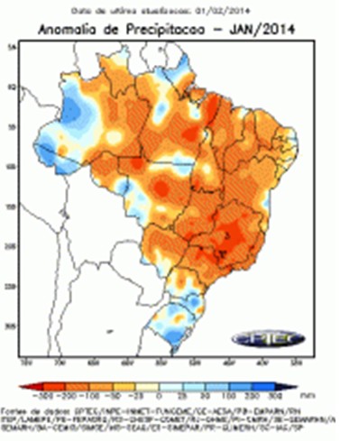 Condiciones de la atmósfera media y alta durante enero generaron un escenario de poca oferta de agua en varias regiones sojeras de Brasil y el mapa siguiente, que produce el INPE-CPTEC, importante Instituto de Investigación de San Pablo, cuantifica lo que expresamos