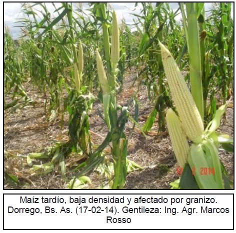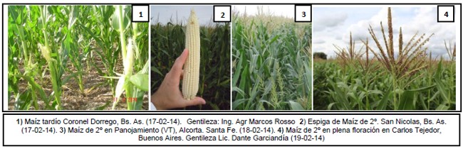 En el Centro-Norte de Córdoba se pueden apreciar lotes en madurez fisiológica, próximos a ser cosechados. Los cuadros de siembras tempranas en esta zona, han sufrido un estrés hídrico severo, viéndose afectado de esta manera los potenciales rendimientos. En contraposición los lotes tardíos hoy presentan muy buenas condiciones, finalizando la etapa vegetativa e ingresando en su período crítico de generación de rendimiento. La mayor expectativa por parte de los productores se encuentra en estos materiales, los cuales están siendo minuciosamente controlados por los ataques de oruga cogollera, y barrenador del tallo entre otras; también por algunas enfermedades fúngicas tales como el tizón y la roya. Similar es el escenario que hoy presenta el sur de Córdoba, en donde se han picado muchos lotes de fechas tempranas a causa de la sequía y de las altas temperaturas, mientras que el resto que aún permanece en pie se encuentra muy próximo a cosecha. Las productividades esperadas para estos cuadros se encuentran muy por debajo de los rendimientos promedios históricos de la zona. A su vez, los materiales tardíos o de segunda ocupación hoy denotan muy buenas condiciones transitando estadíos reproductivos de formación de grano.