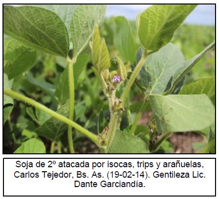 Las regiones NOA y NEA continúan acumulando precipitaciones y esta semana no fue la excepción. Los registros oscilaron desde los 35 hasta los 150 mm, y estas lluvias son de suma importancia para ambas zonas ya que el grueso de los cuadros de soja de primera (más del 85 % del área sojera total) se encuentra a días de comenzar la fase crítica del cultivo. En las provincias de Salta y Tucumán, se están realizando aplicaciones preventivas contra picudo negro, mientras que en el NEA se están monitoreando isocas y chinches con el fin de medir el umbral de daño.