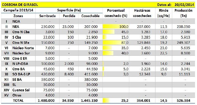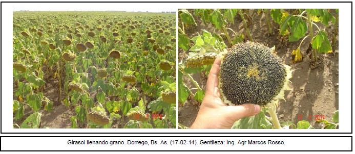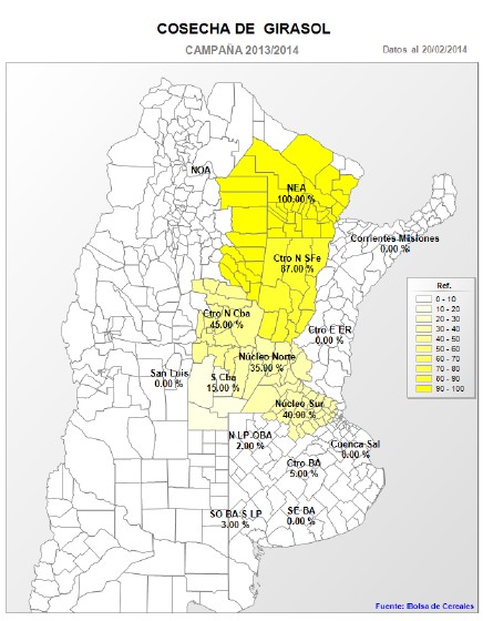En el Centro-Norte de Santa Fe, importante región girasolera, las labores de recolección continúan demoradas debido a las precipitaciones de las últimas semanas, habiendo alcanzado a la fecha un progreso cercano al 87 % de la superficie. Los rendimientos obtenidos estarían siendo los esperados por los productores, ubicándose entre los 15 y 27 qq/Ha, de mejorar las condiciones climáticas, las cosechadoras volverían a los lotes pendientes, debido a que el cultivo se encuentra en madurez comercial.