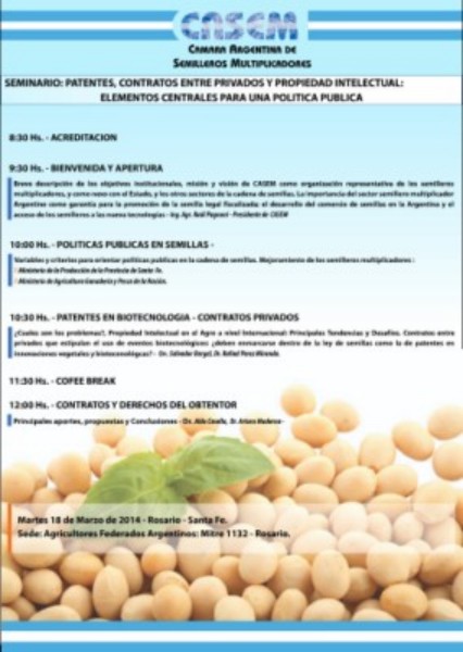 La Cámara Argentina de Semilleros Multiplicadores (Casem) invita al seminario “Patentes, contratos entre privados y propiedad intelectual: elementos centrales para una política pública” que se realizará el próximo martes 18 de marzo en la sede de Agricultores Federados Argentinos (AFA) de Rosario (Mitre 1132).
