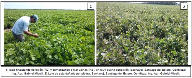 Por otra parte, el extremo norte agrícola presenta condiciones en los materiales tempranos que van de buenas a muy buenas, gracias a las lluvias recibidas durante el mes de febrero. En el NOA, este mes aportó volúmenes elevados de precipitaciones y esto favoreció al muy buen desarrollo de los plantíos hoy transitando en su mayoría etapas de floración y comienzo de cuaje. A nivel sanitario, se releva una alta presión de oruga cogollera, la cual está siendo controlada por medio de aplicaciones. En la vecina región NEA, se destaca también las primeras aplicaciones de fungicidas preventivos en busca de eficientizar las muy buenas condiciones que presentan hoy los cuadros tempranos. Se ha relevado pérdidas por granizo hacia el este de Santiago del Estero, más precisamente en Sachayoj y aledaños.