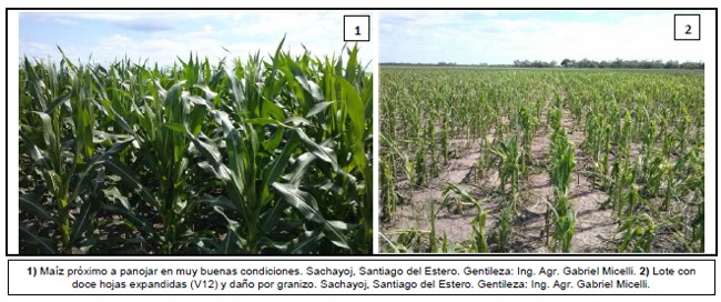 Hacia el Centro-Norte de Córdoba las fuertes lluvias y las mangas de granizo han producido importantes daños en cuadros de maíz, habiéndose relevado pérdidas de lotes totales y parciales. Los anegamientos por excesos de agua y la piedra les jugaron una mala pasada a los productores de esta zona que vienen con grandes expectativa para esta nueva campaña de maíz. Las muy buenas condiciones que vienen presentando los maíces tardíos en esta región hacen suponer que este sería un muy buen año para el cereal. Las proyecciones de producción regional se ubican por encima de los promedios históricos superando en casi todos los casos los 80qq/Ha de promedio. A nivel sanitario, al igual que en el NOA, los ataques de cogollero tuvieron elevada incidencia, a tal punto que se pudieron apreciar híbridos con eventos resistentes a insectos, siendo dañados por estos bichos.