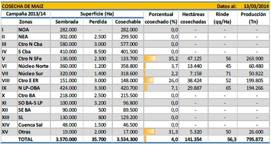 La recolección de maíz con destino grano comercial registró un avance intersemanal de 2 puntos porcentuales. Luego de cosecharse poco más de 140 mil hectáreas en diferentes zonas del área agrícola nacional, la recolección logró alcanzar el 4% de la superficie cosechable prevista para la campaña en curso. De todas maneras el actual progreso, continúa denotando un retraso interanual de -8,4 puntos y esto se debe a las continuas precipitaciones que se han registrado en las zonas donde ya se dio por comenzada la trilla del cereal. Las tareas de recolección se van extendiendo a nuevas regiones, dado que esta semana se comenzaron a trillar los primeros lotes en la zona Núcleo Sur y en el Maíz con doble espiga, sembrado con baja densidad (24 a 32 mil plantas/Ha).